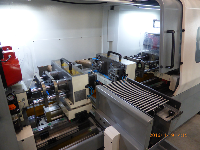 為了降低操作者勞動強度,該機床配置了自動上下料機構(gòu)。該機構(gòu)數(shù)控控制,一次安裝28支工件。送入加工區(qū)域后,機床會自動依次加工,直至完成所有28支工件的加工。送料架再退出加工區(qū),由人工將成品取走。