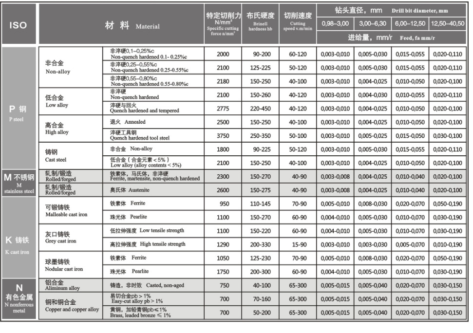 切削用量的選擇與切削過程以及切屑的行程有關(guān),同時(shí)也與被加工零件材料、精度要求和機(jī)床特性有關(guān)。 1切削速度 切削速度主要取決于刀具材料,受到鉆頭耐用度和機(jī)床轉(zhuǎn)速的限制。目前,高速鋼槍鉆一般取切削速度V為35-70m/min; 2進(jìn)給量 進(jìn)給量主要受工藝系統(tǒng)(刀具、工件和機(jī)床等)剛度和強(qiáng)度的限制。此外,還受到加工表面質(zhì)量、排屑效果和切削液的性質(zhì)等因素的影響。目前,高速鋼槍鉆常取f為0.01-0.032mm/r,直徑大者取上限。 槍鉆切削參數(shù)參考下表: