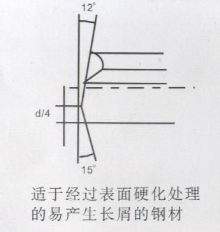 減小槍鉆內(nèi)、外刃角度,即槍鉆內(nèi)外刃磨的更平一些,對加工斷屑有很大的 幫助。另外,切削線速度的提高,對斷屑效果也很明顯。加工不易斷屑材料 時,槍鉆端刃可以參考如下角度: