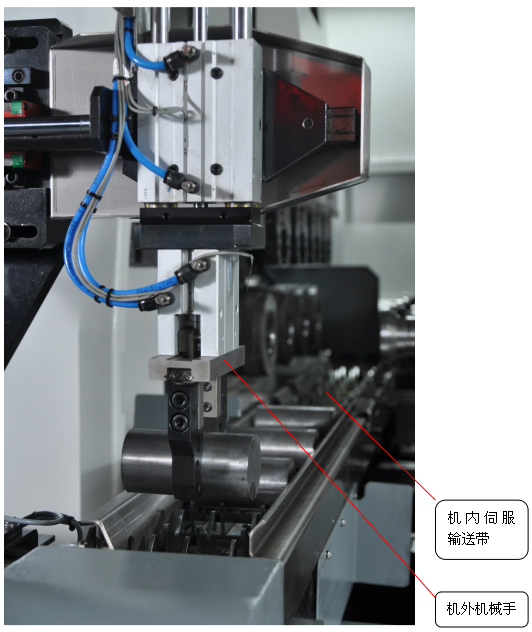 再由機外機械手將工件移放至機內(nèi)伺服傳送帶上。