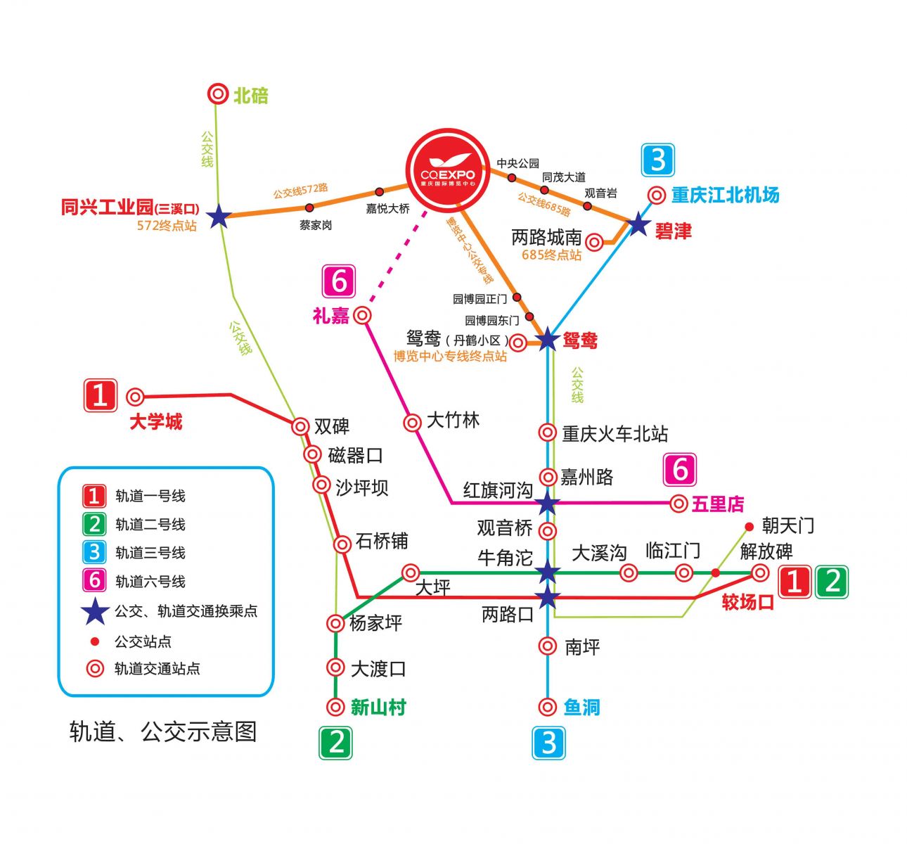 重慶火車站(菜園壩)請在兩路口站乘座輕軌3號線(江北機(jī)場方向)至(軌道鴛鴦?wù)?出站換乘國博中心專線;